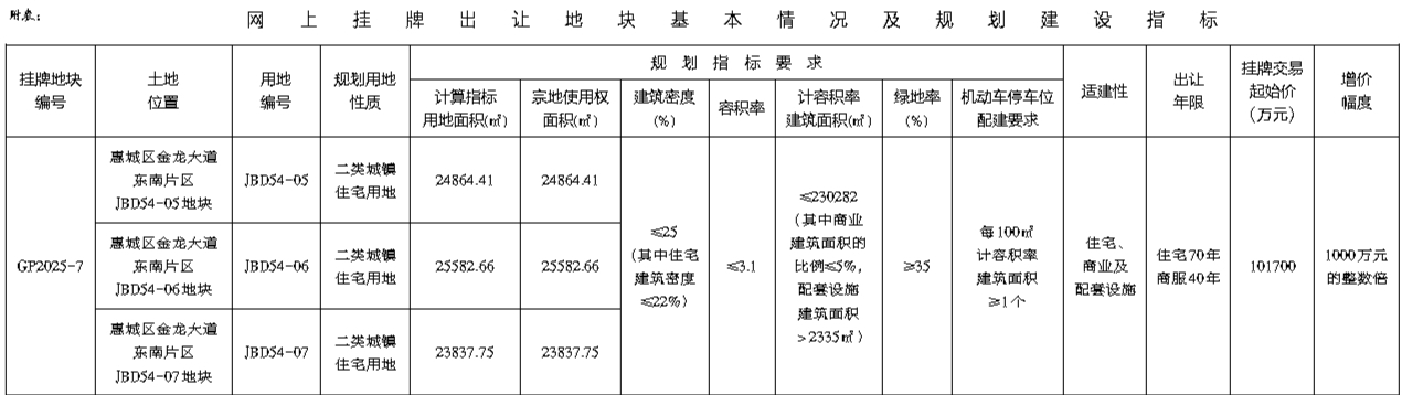 根据《招标拍卖挂牌出让国有建设用地使用权规定》(国土资源部令第39号)和《广东省国有建设用地使用权交易市场管理规定》(广东省人民政府令第304号)的规定,经批准,我局决定以网上挂牌方式公开出让下列一宗国有建设用地使用权。[公告具体内容请登录惠州市公共资源交易中心土地与矿业挂牌电子交易系统(https://tdky.hzggzyjy.cn/)]