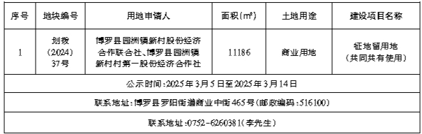 经博罗县建设用地领导小组2024年第20次会议讨论决定,拟将位于博罗县园洲镇和安大道西面地段的1宗国有建设用地使用权以划拨的方式供给有关单位,有关情况公示如下: