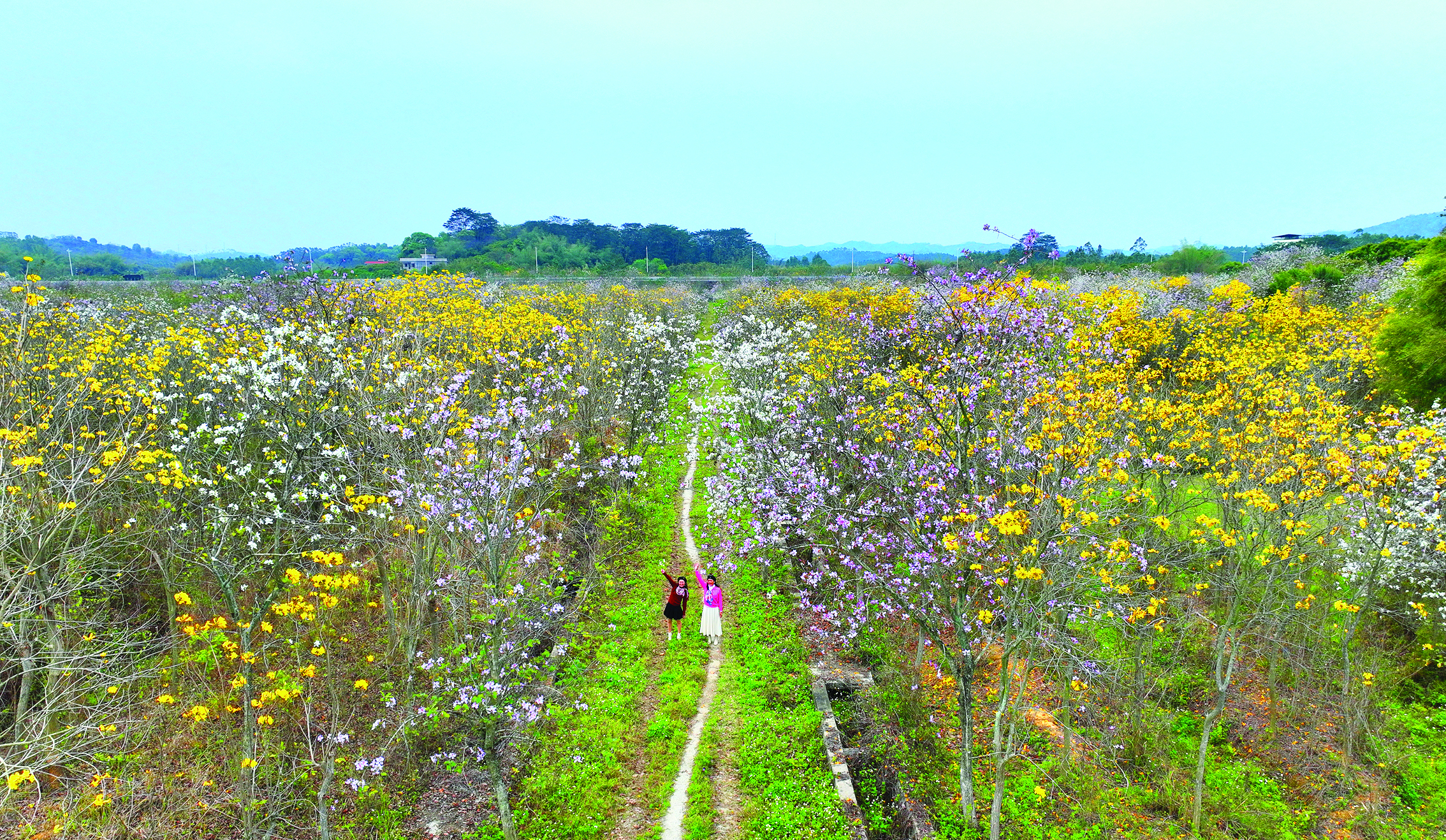 近日,博罗县泰美镇车村村的宫粉紫荆花和黄花风铃木盛开,吸引大量市民前往打卡。这片200多亩的花海成为热门景点,游客纷纷拍照留念,享受自然美景。当地通过发展乡村旅游,不仅提升了村庄的知名度,还带动了经济发展。
