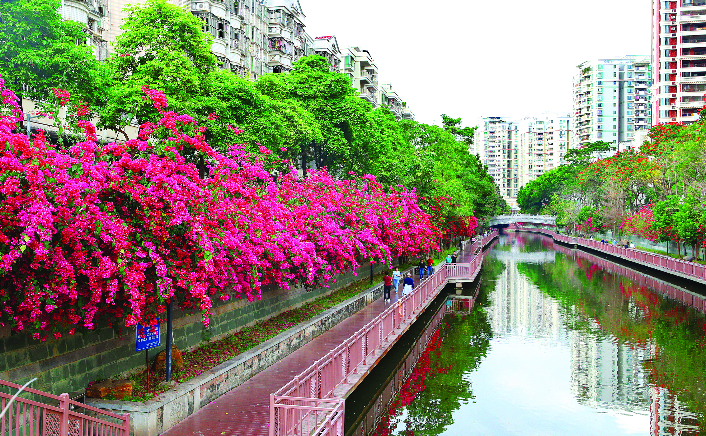 春天,草长莺飞,百花盛开。惠州市区金山河沿岸的三角梅近日竞相开放,春意盎然,娇艳的花朵仿佛给金山河两岸“戴”上了一条美丽的花带,一路繁花错落有致,美得令人心醉,成为了市区一道亮丽的景观。连日来,金山河畔吸引了大量市民和游客前来打卡。