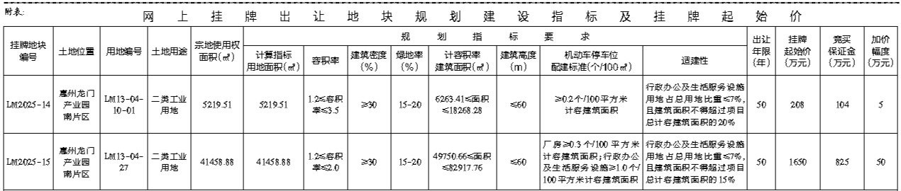 根据《招标拍卖挂牌出让国有建设用地使用权规定》(国土资源部令第39号)和《广东省土地使用权交易市场管理规定》(广东省人民政府令第304号)的规定,经批准,我局决定以网上挂牌方式公开出让2宗国有建设用地使用权。[公告具体内容请登陆惠州市公共资源交易中心土地与矿业网上挂牌交易系统(https://tdky.hzggzyjy.cn/)]