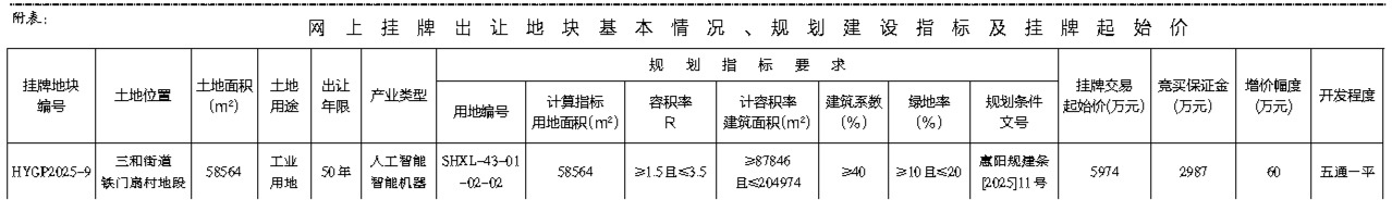 根据《招标拍卖挂牌出让国有建设用地使用权规定》(国土资源部令第39号)和《广东省国有建设用地使用权交易市场管理规定》(广东省人民政府令第304号)的规定,经批准,我局决定以网上挂牌方式公开出让下列一宗国有建设用地使用权。[公告具体内容请登录惠州市公共资源交易中心土地与矿业挂牌电子交易系统(https://tdky.hzggzyjy.cn/)]。