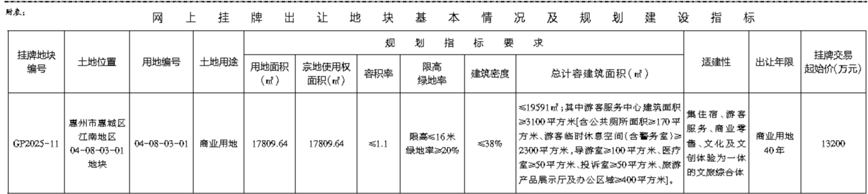 根据《招标拍卖挂牌出让国有建设用地使用权规定》(国土资源部令第39号)和《广东省国有建设用地使用权交易市场管理规定》(广东省人民政府令第304号)的规定,经批准,我局决定以网上挂牌方式公开出让下列1宗国有建设用地使用权。[公告具体内容请登录惠州市公共资源交易中心土地与矿业挂牌电子交易系统(https://tdky.hzggzyjy.cn/)]