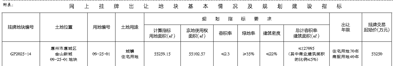 根据《招标拍卖挂牌出让国有建设用地使用权规定》(国土资源部令第39号)和《广东省国有建设用地使用权交易市场管理规定》(广东省人民政府令第304号)的规定,经批准,我局决定以网上挂牌方式公开出让下列1宗国有建设用地使用权。[公告具体内容请登录惠州市公共资源交易中心土地与矿业挂牌电子交易系统(https://tdky.hzggzyjy.cn/)]