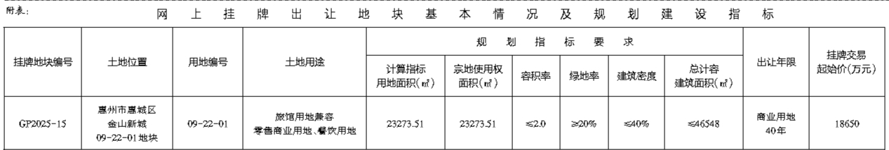 根据《招标拍卖挂牌出让国有建设用地使用权规定》(国土资源部令第39号)和《广东省国有建设用地使用权交易市场管理规定》(广东省人民政府令第304号)的规定,经批准,我局决定以网上挂牌方式公开出让下列1宗国有建设用地使用权。[公告具体内容请登录惠州市公共资源交易中心土地与矿业挂牌电子交易系统(https://tdky.hzggzyjy.cn/)]