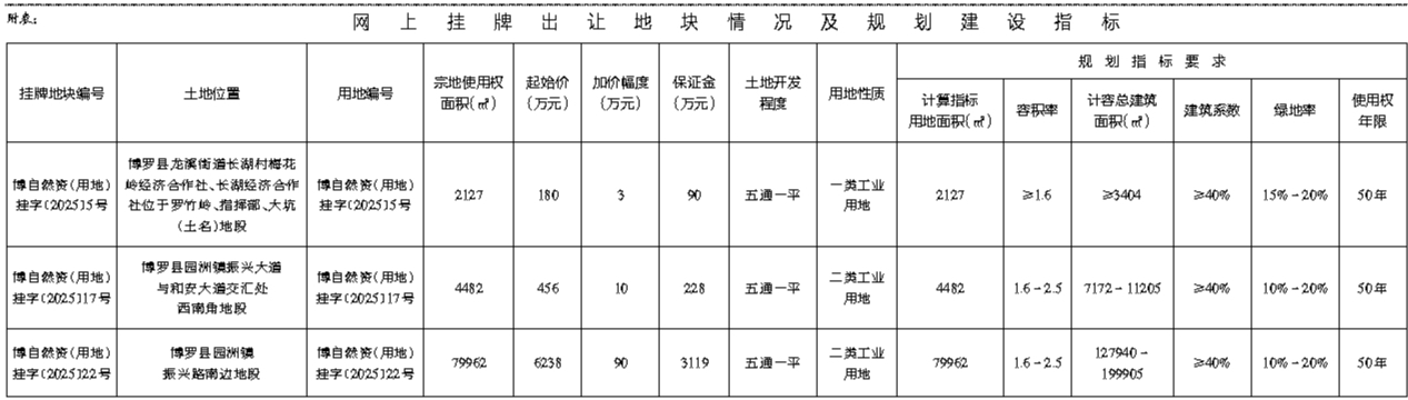 根据《招标拍卖挂牌出让国有建设用地使用权规定》(国土资源部令第39号)和《广东省国有建设用地使用权交易市场管理规定》(广东省人民政府令第304号)的规定,经批准,我局决定以网上挂牌方式公开出让下列3宗国有建设用地使用权。[公告具体内容请登录惠州市公共资源交易中心土地与矿业挂牌电子交易系统(https://tdky.hzggzyjy.cn/)]