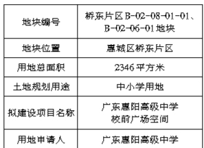 经研究,我局拟将惠城区桥东片区B-02-08-01-01、B-02-06-01地块国有建设用地使用权划拨供应给广东惠阳高级中学,该宗地用地总面积2346平方米,作为学校前广场空间使用(须保证惠新中街通达性,不得围蔽),土地用途为教育用地。