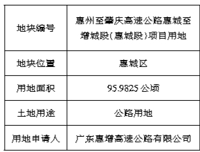 经研究,我局拟将惠州至肇庆高速公路惠城至增城段项目(惠城段)国有建设用地使用权划拨供应给广东惠增高速公路有限公司,用地面积为95.9825公顷,用地位置范围详见附图。用地规划用途为公路用地。具体如下: