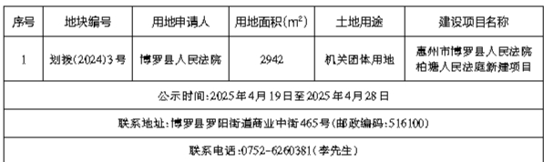 经博罗县建设用地领导小组2024年第3次会议讨论决定,拟将位于博罗县柏塘镇柏塘经济联合总社柏塘道班地段的1宗国有建设用地使用权以划拨的方式供给有关单位,有关情况公示如下:
