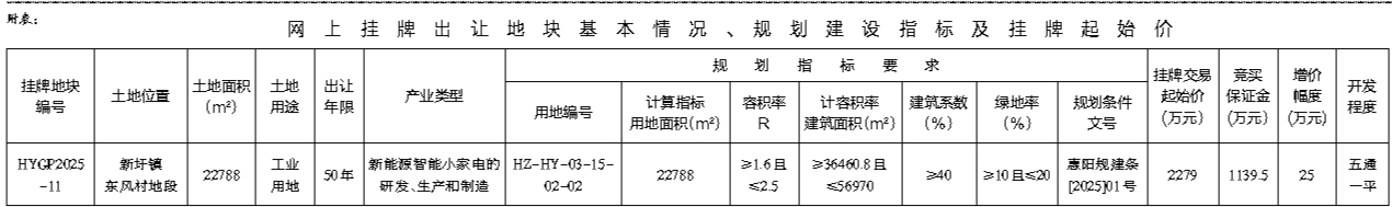 根据《招标拍卖挂牌出让国有建设用地使用权规定》(国土资源部令第39号)和《广东省国有建设用地使用权交易市场管理规定》(广东省人民政府令第304号)的规定,经批准,我局决定以网上挂牌方式公开出让下列一宗国有建设用地使用权。[公告具体内容请登录惠州市公共资源交易中心土地与矿业挂牌电子交易系统(https://tdky.hzggzyjy.cn/)]。