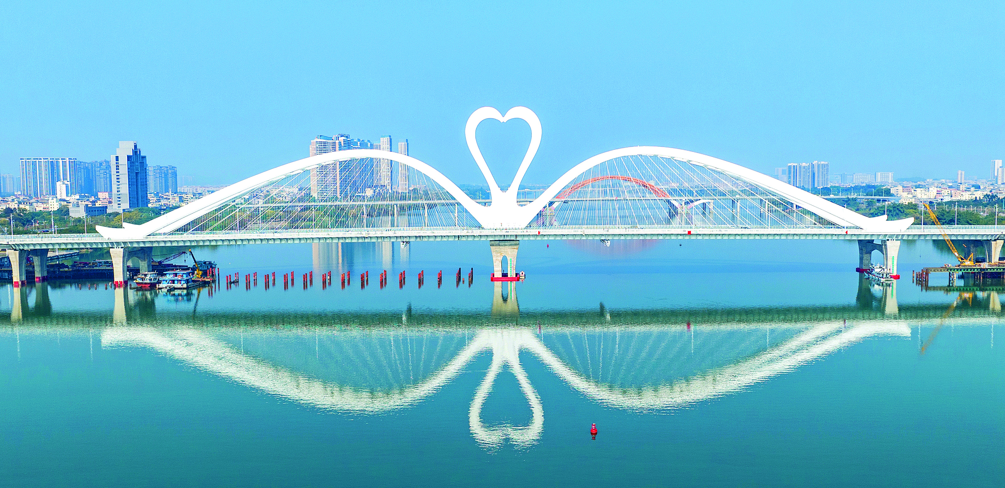 主桥合龙,大桥艺术造型得以完整呈现,天鹅之姿矗立于东江之上,“天鹅引颈高歌”的姿态呼之欲出