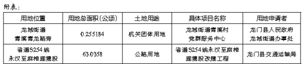 龙门县人民政府龙城街道办事处、龙门县交通运输局向我局提出用地申请,我局拟将2宗国有土地使用权以划拨方式供地。根据《关于贯彻落实〈国务院关于促进节约集约用地的通知〉的通知》(国土资发[2008]16号)有关要求,现对该宗划拨用地的有关情况予以公示,公示时间为2025年5月8日至2025年5月17日(公示期间只接受书面意见)。公示期满无异议的,我局将拟定划拨供地方案报政府审批,办理划拨供地手续。