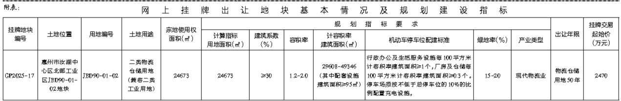 根据《招标拍卖挂牌出让国有建设用地使用权规定》(国土资源部令第39号)和《广东省国有建设用地使用权交易市场管理规定》(广东省人民政府令第304号)的规定,经批准,我局决定以网上挂牌方式公开出让下列一宗国有建设用地使用权。公告具体内容请登录惠州市公共资源交易中心土地与矿业挂牌电子交易系统(https://tdky.hzggzyjy.cn/):