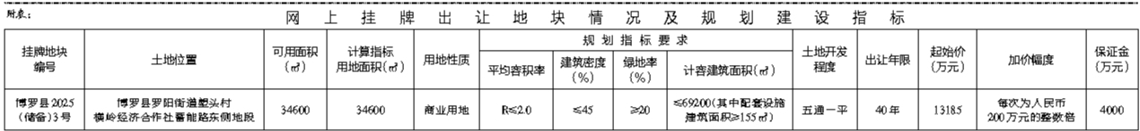 根据《招标拍卖挂牌出让国有建设用地使用权规定》(国土资源部令第39号)和《广东省国有建设用地使用权交易市场管理规定》(广东省人民政府令第304号)的规定,经批准,我局决定以网上挂牌方式公开出让下列一宗国有建设用地使用权。[公告具体内容请登录惠州市公共资源交易中心土地与矿业挂牌电子交易系统(https://tdky.hzggzyjy.cn/]。