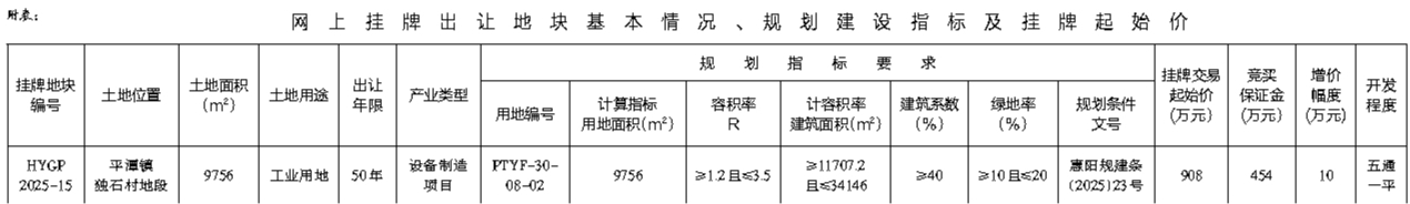 根据《招标拍卖挂牌出让国有建设用地使用权规定》(国土资源部令第39号)和《广东省国有建设用地使用权交易市场管理规定》(广东省人民政府令第304号)的规定,经批准,我局决定以网上挂牌方式公开出让下列一宗国有建设用地使用权。[公告具体内容请登录惠州市公共资源交易中心土地与矿业挂牌电子交易系统(https://tdky.hzggzyjy.cn/)]。