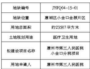 经研究,我局拟将惠城区小金口金源片区JYPQ04-15-01地块国有建设用地使用权划拨供应给惠州市第三人民医院,该宗地用地总面积约23507平方米,土地用途为医疗卫生用地,拟建设项目为惠州市第三人民医院小金口分院项目。