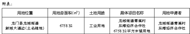 龙城街道青溪村东海经济合作社向我局提出用地申请,我局拟将1宗国有土地使用权以划拨方式供地。根据《关于贯彻落实〈国务院关于促进节约集约用地的通知〉的通知》(国土资发[2008]16号)有关要求,现对该宗划拨用地的有关情况予以公示,公示时间为2025年6月17日至2025年6月27日(公示期间只接受书面意见)。公示期满无异议的,我局将拟定划拨供地方案报政府审批,办理划拨供地手续。