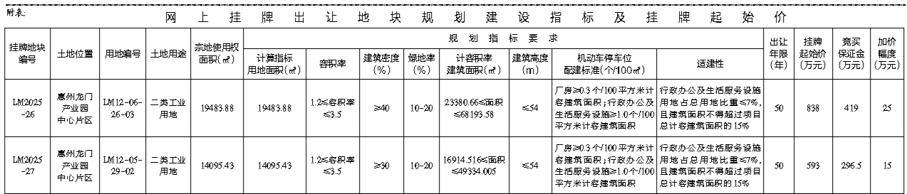 根据《招标拍卖挂牌出让国有建设用地使用权规定》(国土资源部令第39号)和《广东省土地使用权交易市场管理规定》(广东省人民政府令第304号)的规定,经批准,我局决定以网上挂牌方式公开出让2宗国有建设用地使用权。[公告具体内容请登陆惠州市公共资源交易中心土地与矿业网上挂牌交易系统(https://tdky.hzggzyjy.cn/)]