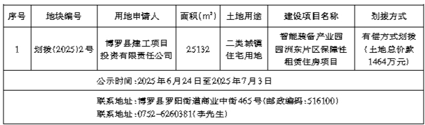 经博罗县建设用地领导小组2025年第3次会议讨论决定,拟将位于博罗县园洲镇杨花路南面地段的1宗国有建设用地使用权以有偿划拨的方式供给有关单位,有关情况公示如下: