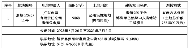 经博罗县建设用地领导小组2025年第6次会议讨论决定,拟将博罗县柏塘镇新陂股份经济合作联合社位于新陂村赤米田(土名)地段的1宗国有建设用地使用权以有偿划拨的方式供给有关单位,有关情况公示如下: