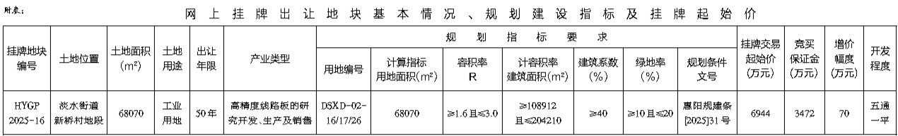 根据《招标拍卖挂牌出让国有建设用地使用权规定》(国土资源部令第39号)和《广东省国有建设用地使用权交易市场管理规定》(广东省人民政府令第304号)的规定,经批准,我局决定以网上挂牌方式公开出让下列一宗国有建设用地使用权。[公告具体内容请登录惠州市公共资源交易中心土地与矿业挂牌电子交易系统(https://tdky.hzggzyjy.cn/)]。