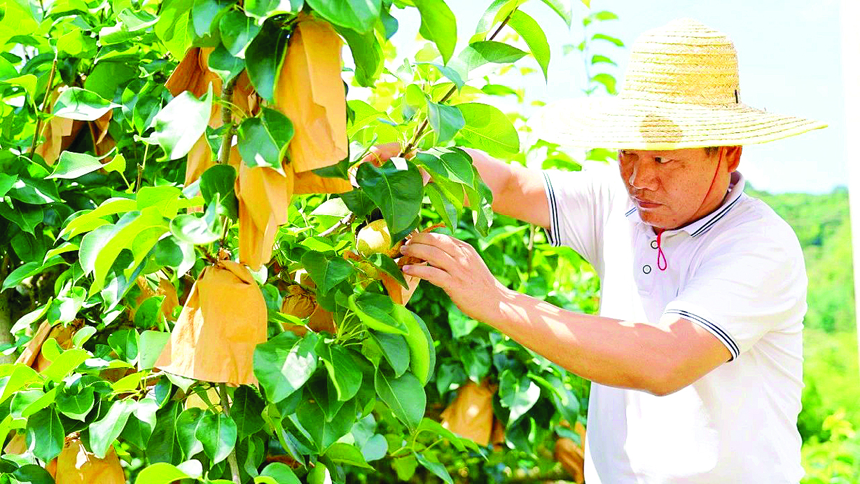 龙潭镇铁岗社区马岭村民小组一早脆梨种植园里,一颗颗饱满的早脆梨被精心包裹在“纸马甲”中,沉甸甸地垂挂枝头。种植户廖庆全穿梭在果树间,仔细查看果实的生长情况。据介绍,今年早脆梨长势喜人,2000棵梨树预计总产量10万斤,7月中旬就能采摘。口感爽甜、细嫩无渣的早脆梨,成为铁岗社区一道亮丽的田园风景线。