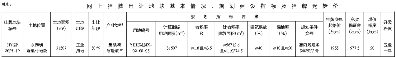 根据《招标拍卖挂牌出让国有建设用地使用权规定》(国土资源部令第39号)和《广东省国有建设用地使用权交易市场管理规定》(广东省人民政府令第304号)的规定,经批准,我局决定以网上挂牌方式公开出让下列一宗国有建设用地使用权。[公告具体内容请登录惠州市公共资源交易中心土地与矿业挂牌电子交易系统(https://tdky.hzggzyjy.cn/)]。