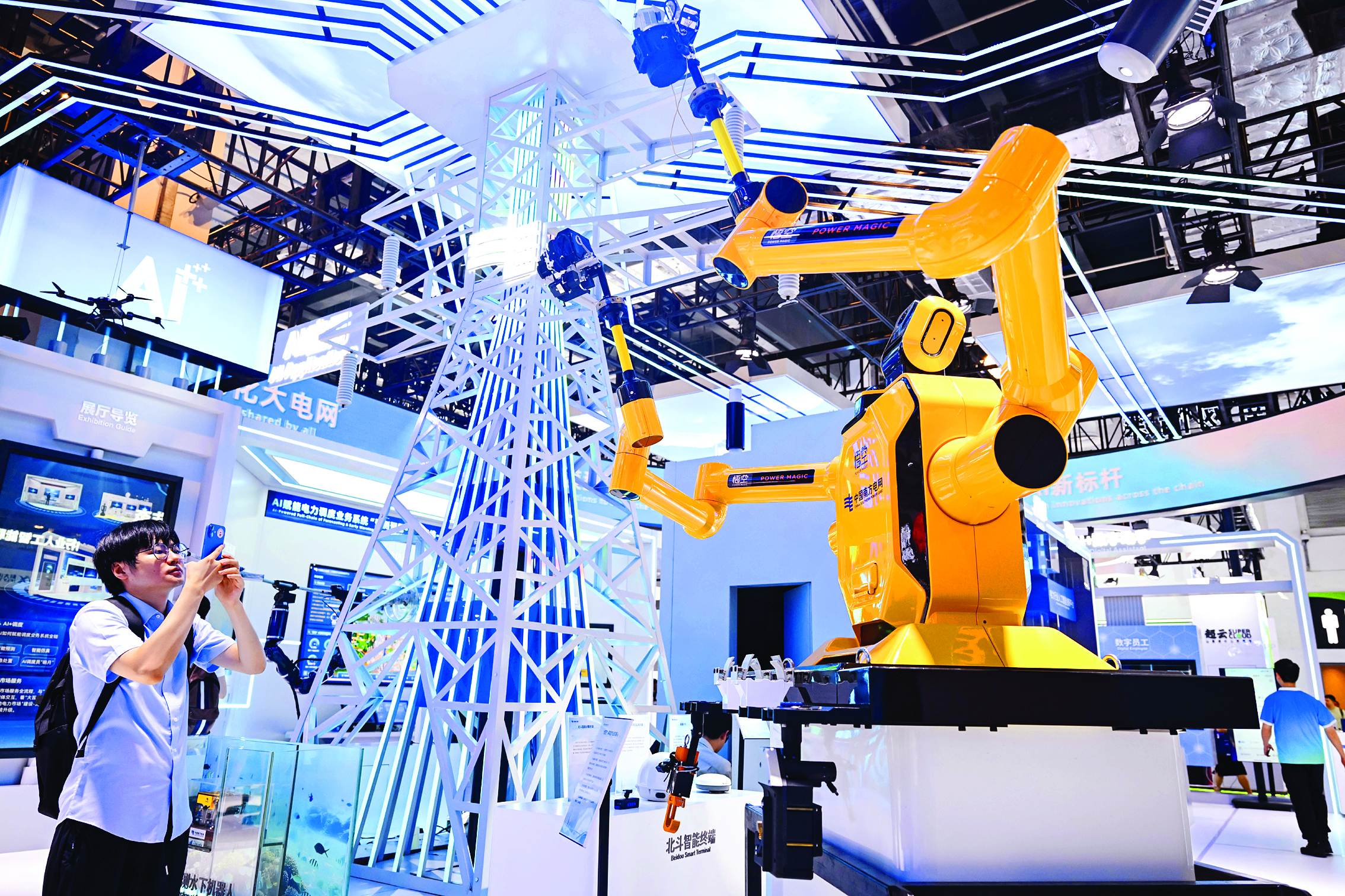 这是参观者在展览现场中国南方电网展区拍摄“悟空”带电作业机器人(2025年7月28日摄)。