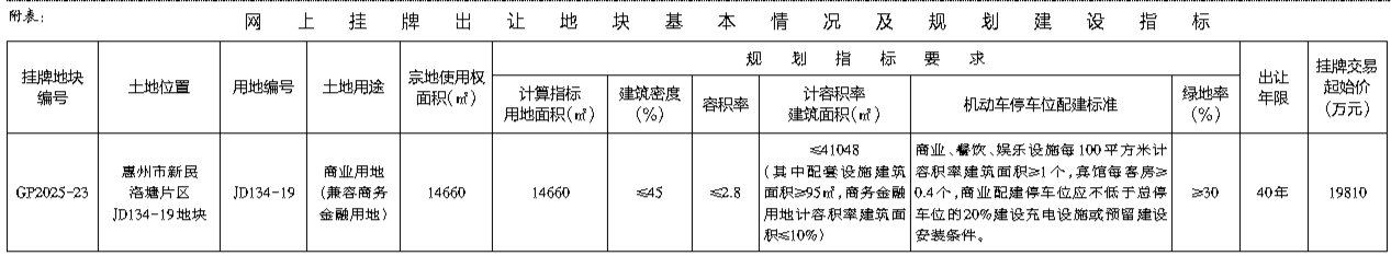 根据《招标拍卖挂牌出让国有建设用地使用权规定》(国土资源部令第39号)和《广东省国有建设用地使用权交易市场管理规定》(广东省人民政府令第304号)的规定,经批准,我局决定以网上挂牌方式公开出让下列一宗国有建设用地使用权。公告具体内容请登录惠州市公共资源交易中心土地与矿业挂牌电子交易系统(https://tdky.hzggzyjy.cn/):