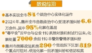 惠州给出这样的一条建设路径——立足便捷为民,县(区)、镇(街)综治中心选址紧邻行政服务中心、党群服务中心等群众熟悉、交通便利的地方,县(区)重在推进一站式化解矛盾纠纷、镇(街)突出就地就近化解矛盾纠纷。2024年,惠州全市各级综治中心受理矛盾纠纷6.6万余件,其中95%化解在基层。