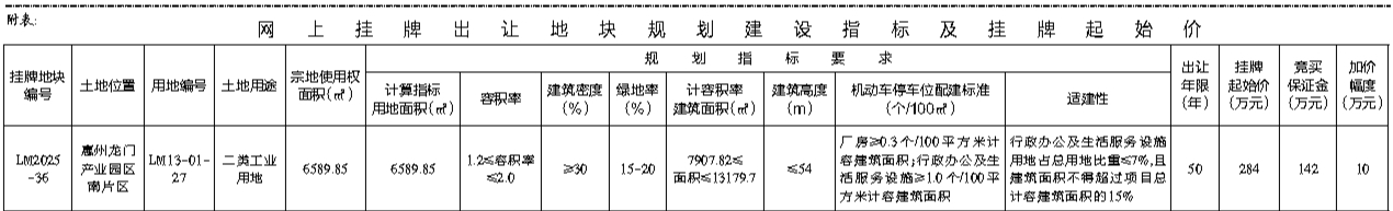 根据《招标拍卖挂牌出让国有建设用地使用权规定》(国土资源部令第39号)和《广东省土地使用权交易市场管理规定》(广东省人民政府令第304号)的规定,经批准,我局决定以网上挂牌方式公开出让1宗国有建设用地使用权。[公告具体内容请登陆惠州市公共资源交易中心土地与矿业网上挂牌交易系统(https://tdky.hzggzyjy.cn/)]