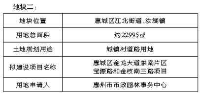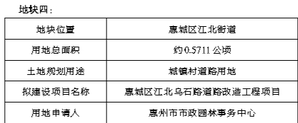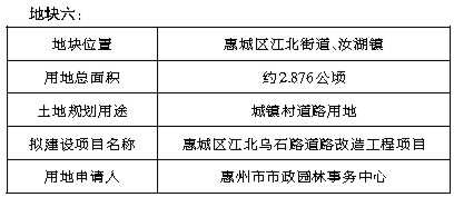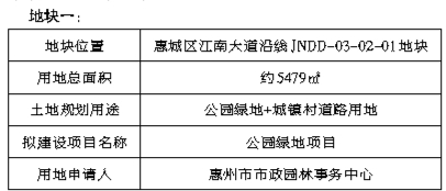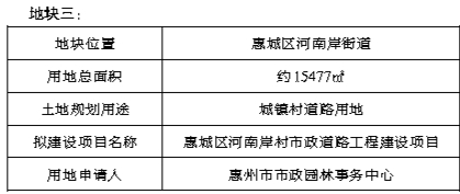 经研究,我局拟划拨供应惠城区江南大道沿线JNDD-03-02-01地块等6宗市政公用项目用地,土地用途、建设项目等信息如下。