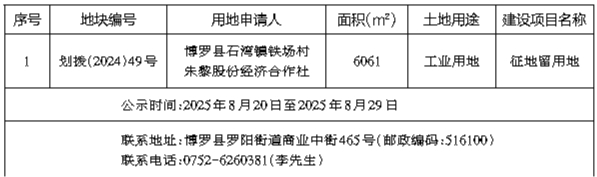 经博罗县建设用地领导小组2025年第8次会议讨论决定,拟将位于博罗县石湾镇明月四路东侧地段的1宗国有建设用地使用权以划拨的方式供给有关单位,有关情况公示如下: