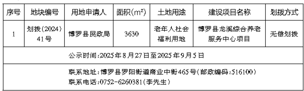 经博罗县建设用地领导小组2025年第11次会议讨论决定,拟将位于博罗县龙溪街道龙溪圩人民路地段的1宗国有建设用地使用权以无偿划拨的方式供给有关单位,有关情况公示如下: