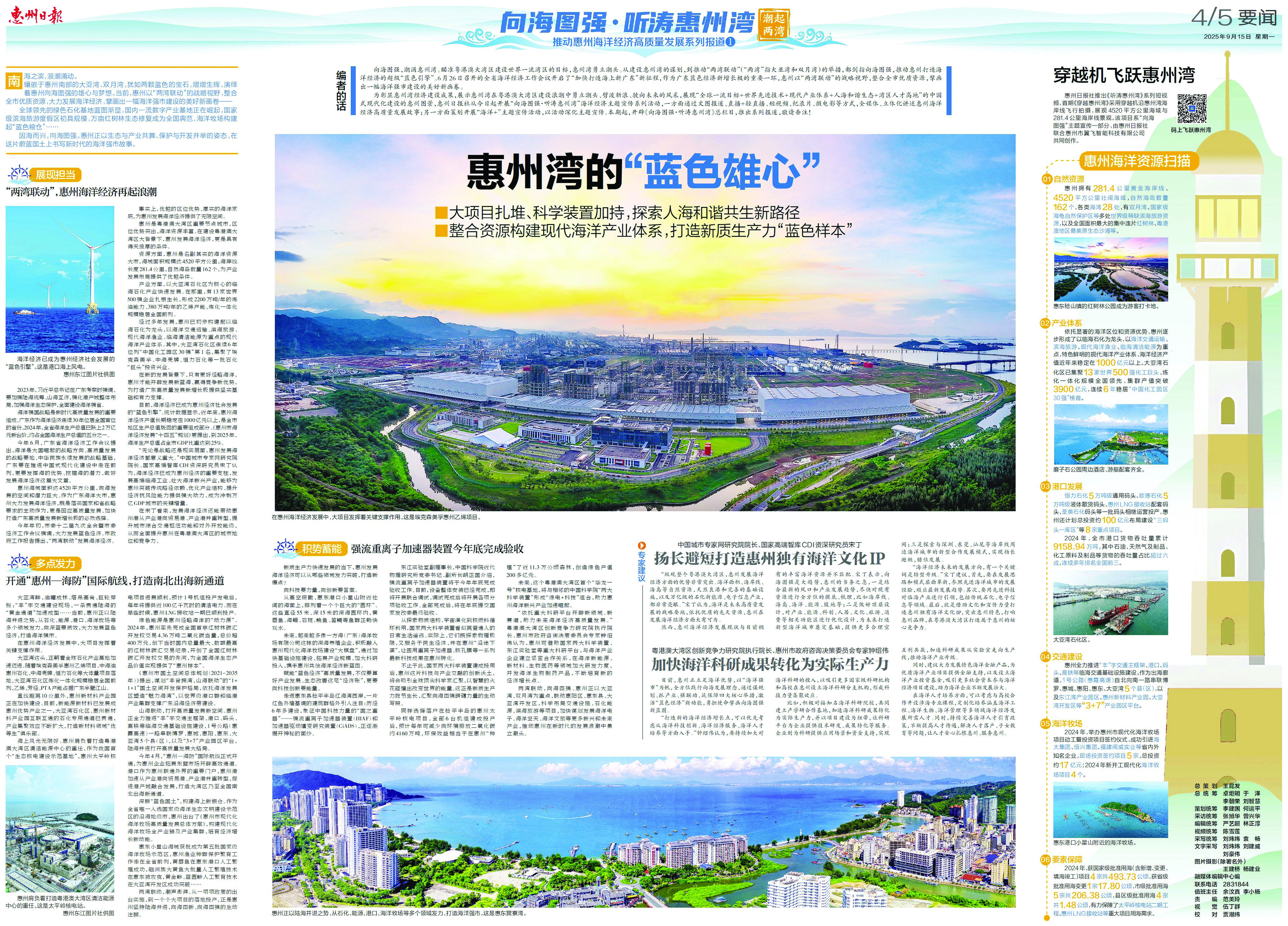 为彰显惠州湾经济建设成果,展示惠州湾在粤港澳大湾区建设浪潮中勇立潮头、劈波斩浪、驶向未来的风采,展现“全球一流目标+世界先进技术+现代产业体系+人海和谐生态+湾区人才高地”的中国式现代化建设的惠州图景,惠州日报社今起开展“向海图强·听涛惠州湾”海洋经济主题宣传系列活动,一方面通过文图报道、直播+轻直播、短视频、纪录片、微电影等方式,全媒体、立体化讲述惠州海洋经济高质量发展故事;另一方面策划开展“海洋+”主题宣传活动,以活动深化主题宣传。本期起开辟《向海图强·听涛惠州湾》总栏目,推出系列报道,敬请垂注!(跃文)