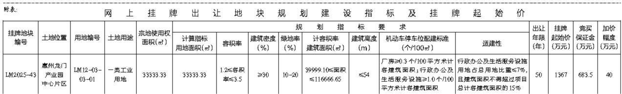 根据《招标拍卖挂牌出让国有建设用地使用权规定》(国土资源部令第39号)和《广东省土地使用权交易市场管理规定》(广东省人民政府令第304号)的规定,经批准,我局决定以网上挂牌方式公开出让1宗国有建设用地使用权。[公告具体内容请登陆惠州市公共资源交易中心土地与矿业网上挂牌交易系统(https://tdky.hzggzyjy.cn/)]