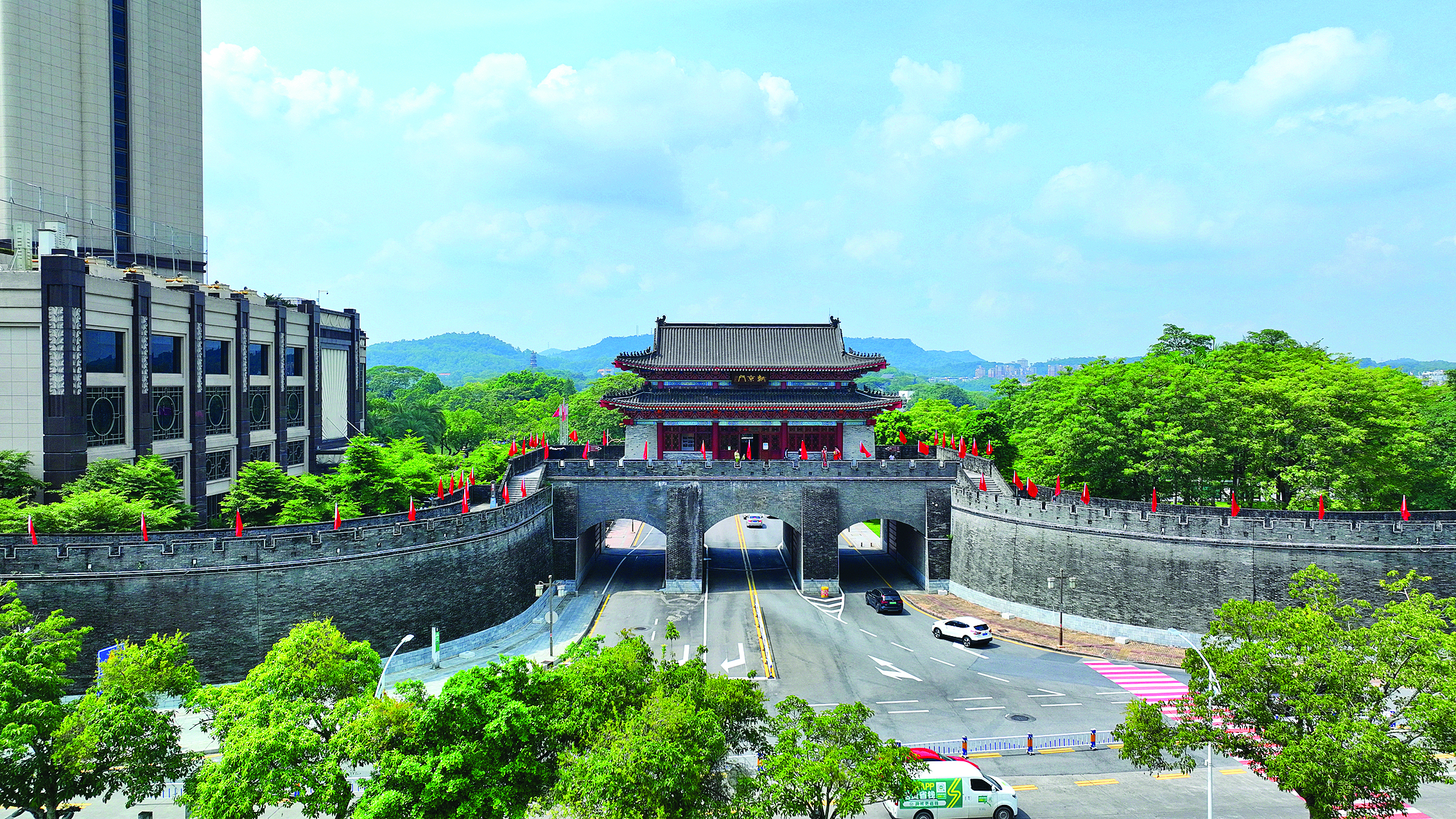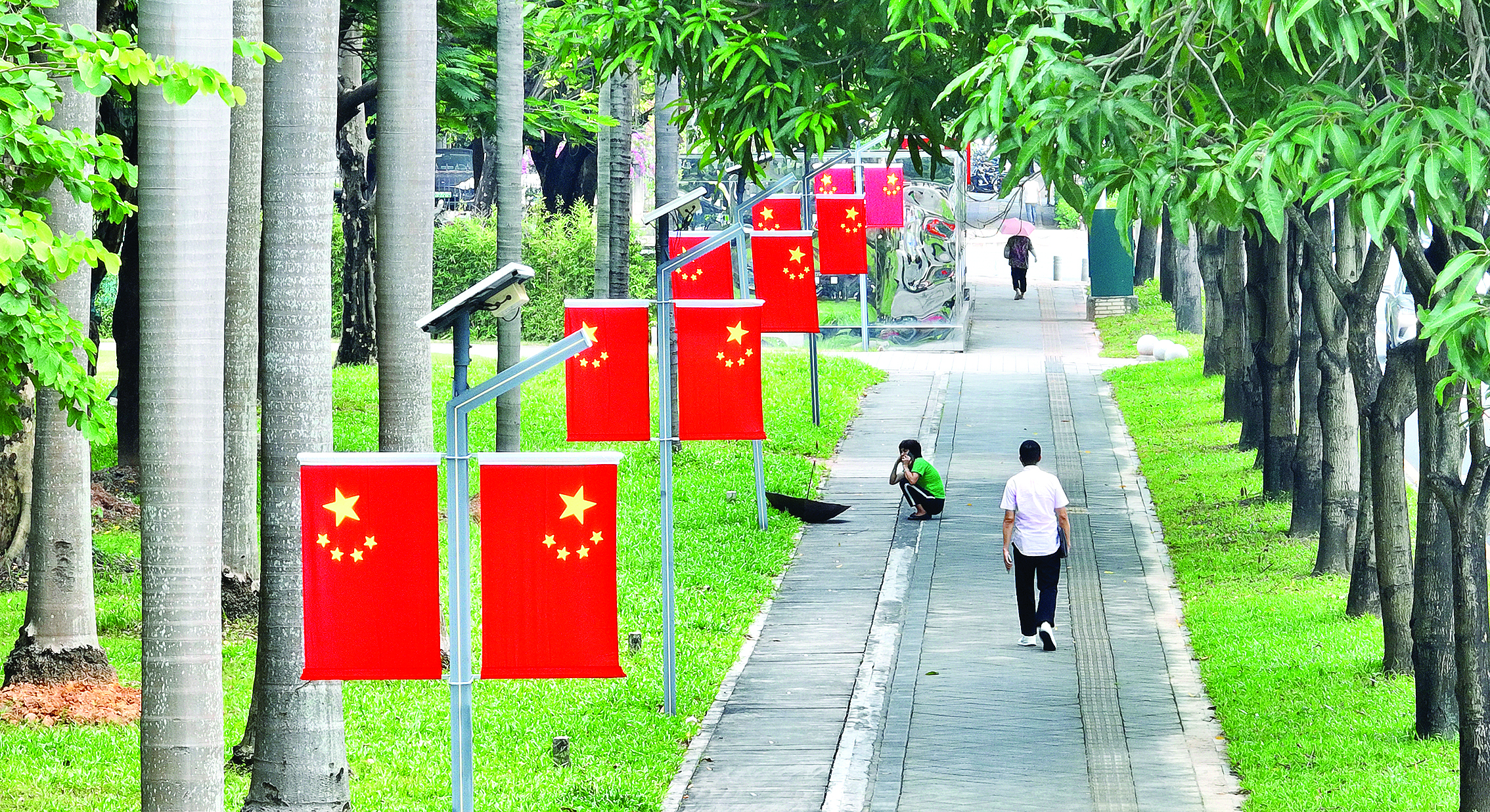 国庆节,惠州城区五星红旗挂满大街小巷,满眼皆是“中国红”,用“中国红”装扮道路、公园和景区,将国庆的氛围感拉满,洋溢着喜庆热烈的节日气氛。