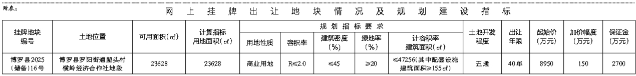 根据《招标拍卖挂牌出让国有建设用地使用权规定》(国土资源部令第39号)和《广东省国有建设用地使用权交易市场管理规定》(广东省人民政府令第304号)的规定,经批准,我局决定以网上挂牌方式公开出让下列一宗国有建设用地使用权。[公告具体内容请登录惠州市公共资源交易中心土地与矿业挂牌电子交易系统(https://tdky.hzggzyjy.cn/)]。