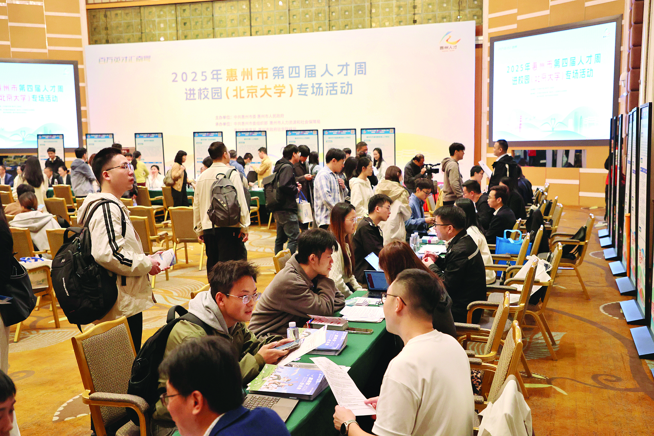 10月15日,由市委、市政府主办,市委组织部、市人力资源和社会保障局、市教育局、市政府驻京联络处承办的“百万英才汇南粤”暨2025年惠州市第四届人才周进校园(北京)专场活动走进北京大学。图为我市民营企业招聘的岗位受到了北大学子的青睐。惠州日报记者王建桥 摄