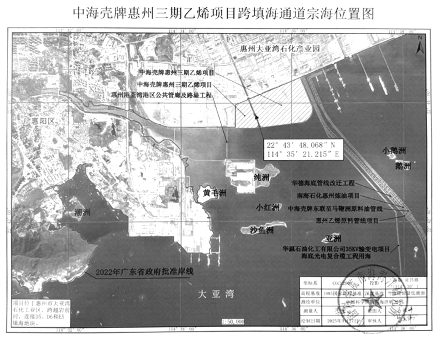 中海壳牌石油化工有限公司拟在广东省惠州市惠州大亚湾石化工业区申请实施中海壳牌惠州三期乙烯项目跨填海地块通道项目,申请用海期限至2072年10月24日,用海面积为0.1709公顷,用海方式为透水构筑物。按照《海域使用管理法》《广东省海域使用管理条例》的有关规定,现予公示,公示期10月16日-10月25日,共10天。
