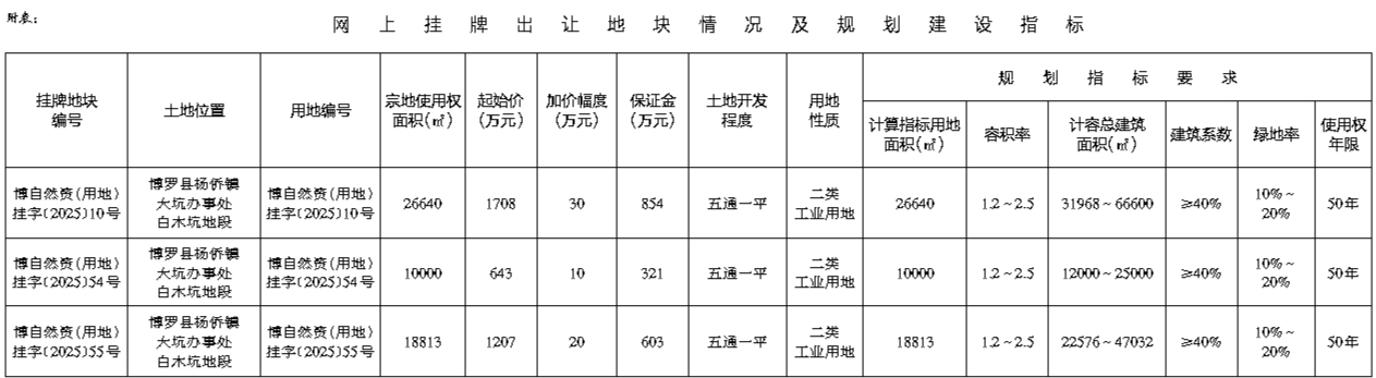 根据《招标拍卖挂牌出让国有建设用地使用权规定》(国土资源部令第39号)和《广东省国有建设用地使用权交易市场管理规定》(广东省人民政府令第304号)的规定,经批准,我局决定以网上挂牌方式公开出让下列3宗国有建设用地使用权。[公告具体内容请登录惠州市公共资源交易中心土地与矿业挂牌电子交易系统(https://tdky.hzggzyjy.cn/)]