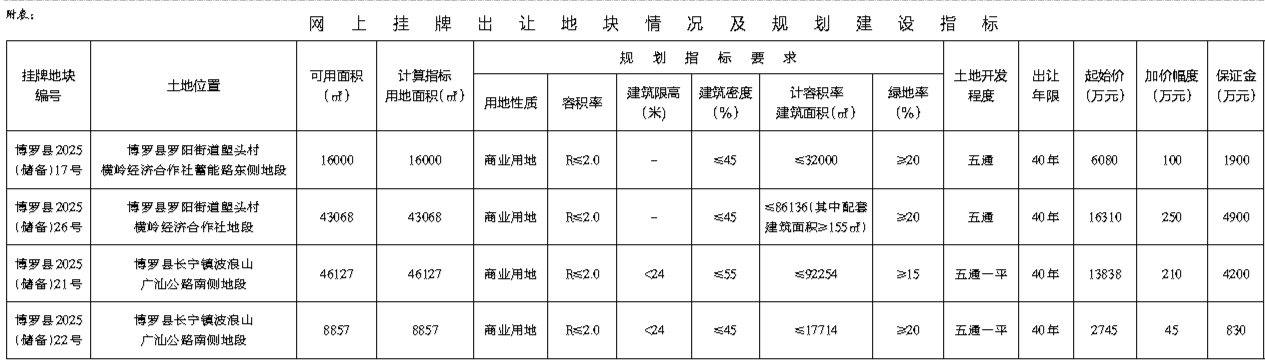 根据《招标拍卖挂牌出让国有建设用地使用权规定》(国土资源部令第39号)和《广东省国有建设用地使用权交易市场管理规定》(广东省人民政府令第304号)的规定,经批准,我局决定以网上挂牌方式公开出让下列四宗国有建设用地使用权。[公告具体内容请登录惠州市公共资源交易中心土地与矿业挂牌电子交易系统(https://tdky.hzggzyjy.cn/)]。
