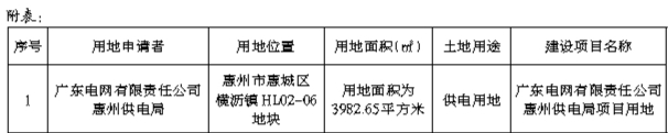 根据广东电网有限责任公司惠州供电局向我局提出办理供电用地的申请,我局拟将位于惠州市惠城区横沥镇HL02-06地块用地面积为3982.65平方米国有建设用地以划拨方式供地给广东电网有限责任公司惠州供电局作为供电用地。根据国土资源部《关于贯彻落实〈国务院关于促进节约集约用地的通知〉的通知》(国土资发[2008]16号)有关要求,现对上述划拨地块的有关情况予以公示(详见附表),公示时间为2025年10月21日至10月30日(公示期间只接受书面意见)。公示期满无异议的,我局将拟定划拨供地方案报区政府审批,办理划拨供地手续。