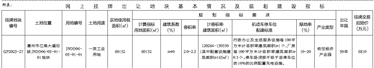 根据《招标拍卖挂牌出让国有建设用地使用权规定》(国土资源部令第39号)和《广东省国有建设用地使用权交易市场管理规定》(广东省人民政府令第304号)的规定,经批准,我局决定以网上挂牌方式公开出让下列一宗国有建设用地使用权。公告具体内容请登录惠州市公共资源交易中心土地与矿业挂牌电子交易系统(https://tdky.hzggzyjy.cn/):