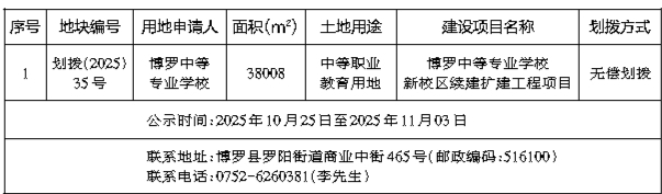经博罗县建设用地领导小组2025年第12次会议讨论决定,拟将位于博罗县罗阳街道中城北路北侧地段的1宗国有建设用地使用权以无偿划拨的方式供给有关单位,有关情况公示如下: