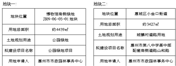 经研究,我局拟划拨供应博物馆南侧绿地改造项目JBN-06-03-01地块、惠州市第八中学高中部配套南侧道路山和路项目用地,土地用途、建设项目等信息如下表。