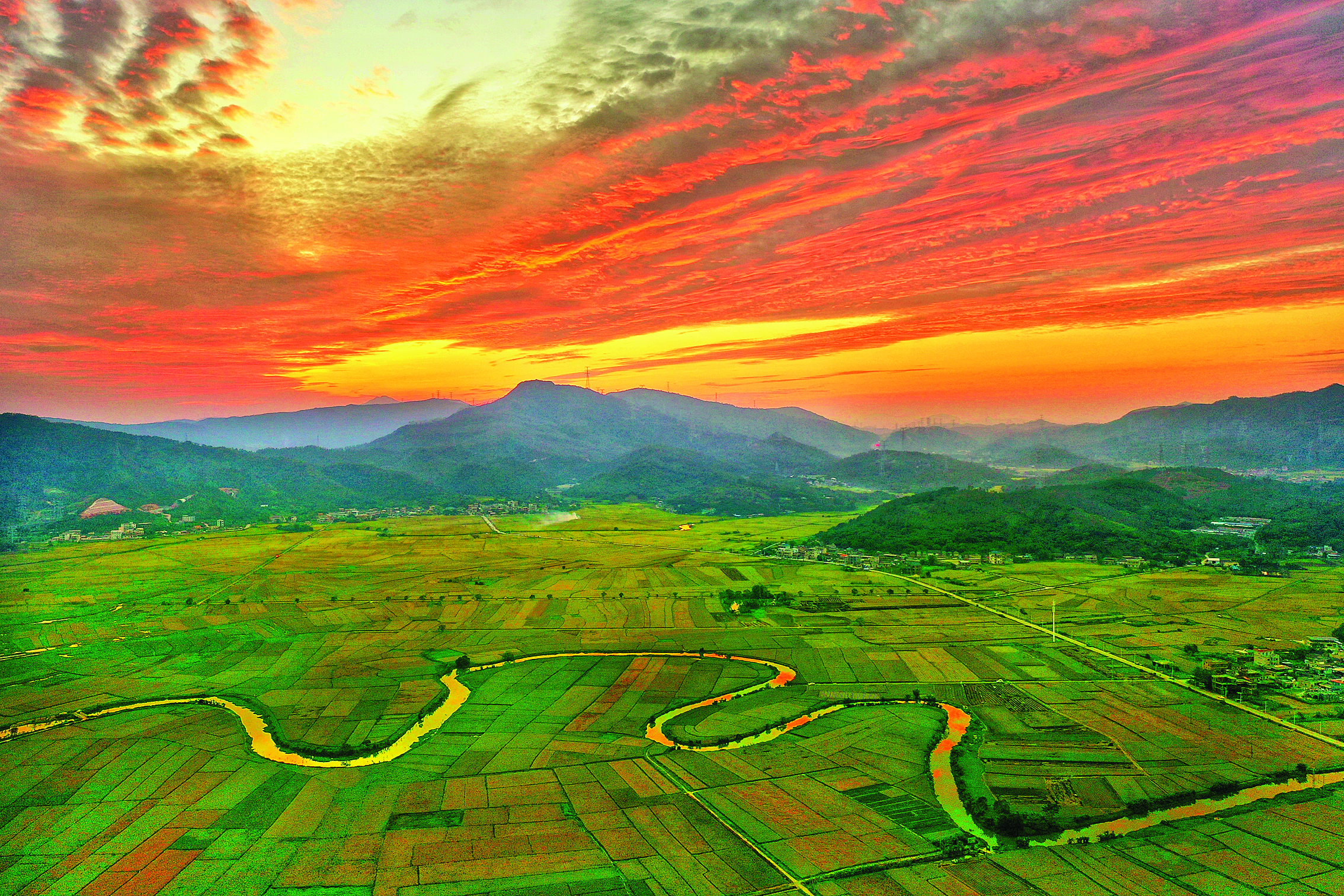 秋日傍晚,惠东县稔山镇竹园村稻田一片美丽景象。航拍视角下,黄绿稻浪如调色盘铺展,蜿蜒河流在晚霞下泛着金波,与远山、绚烂云霞构成梦幻画卷。