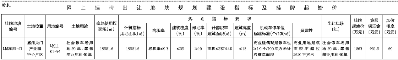 根据《招标拍卖挂牌出让国有建设用地使用权规定》(国土资源部令第39号)和《广东省土地使用权交易市场管理规定》(广东省人民政府令第304号)的规定,经批准,我局决定以网上挂牌方式公开出让1宗国有建设用地使用权。[公告具体内容请登陆惠州市公共资源交易中心土地与矿业网上挂牌交易系统(https://tdky.hzggzyjy.cn/)]