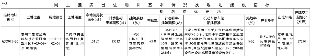 根据《招标拍卖挂牌出让国有建设用地使用权规定》(国土资源部令第39号)和《广东省国有建设用地使用权交易市场管理规定》(广东省人民政府令第304号)的规定,经批准,我局决定以网上挂牌方式公开出让下列一宗国有建设用地使用权。公告具体内容请登录惠州市公共资源交易中心土地与矿业挂牌电子交易系统(https://tdky.hzggzyjy.cn/):