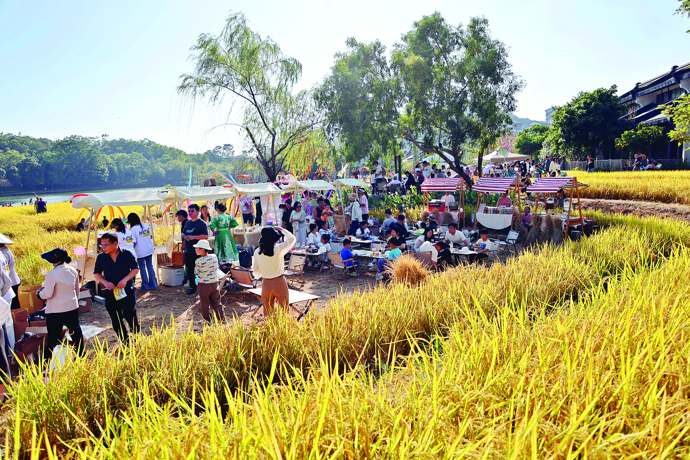 金黄稻浪间,一场别开生面的稻田欢聚在惠州汤泉稻田间展开。日前,市民在白色帐篷与红白条纹遮阳棚下,或围坐野餐、或打卡文创摊位,孩童们在稻田间追逐嬉笑,冬日暖阳裹着稻穗清香,将丰收的喜悦揉进烟火气里,串联起乡村文旅新业态。